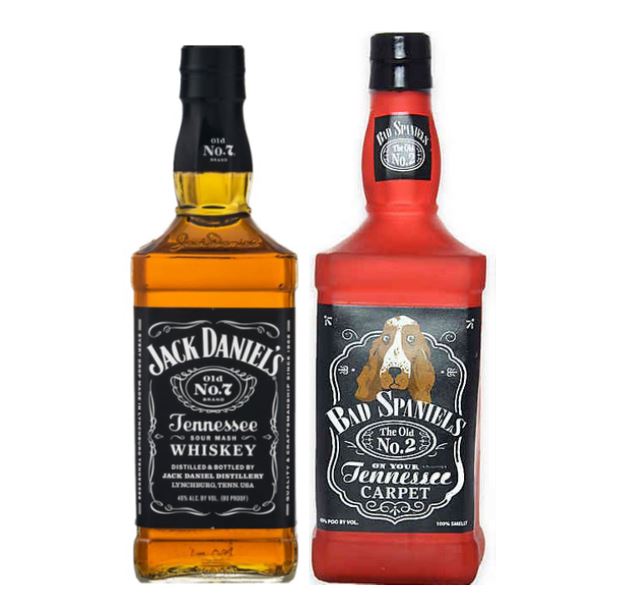 Jack Daniel’s owns several federal registrations covering its famous whiskey bottle, including brand names appearing on the label (such as JACK DANIEL’S and OLD NO. 7) and the trade dress in the bottle itself. VIP Products makes and sells a chewable rubber dog toy called BAD SPANIELS designed to evoke Jack Daniel’s famous whiskey bottle, but adding scatological humor, such as “43% poo by vol.” and “100% smelly” for “40% alc. by vol. (80 proof),” and “Old No. 2 on your Tennessee carpet” instead of “Old No. 7” and “Tennessee whiskey”: